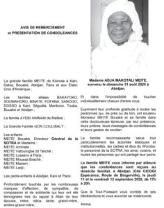 Côte d’Ivoire / Décès de la mère du DG de la SOTRA : Avis de remerciement et de présentation de condoléances