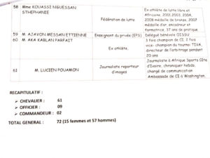 Conviés à cette soirée de dîner-gala organisée par la Direction générale des sports et de la vie fédérale (DGSVF), les agents et cadres du Ministère des Sports et du cadre de vie se sont mis sur leur 31 pour célébrer l’excellence et le mérite dans une ambiance de strass et paillettes. Ainsi, 72 agents dont des directeurs centraux, des directeurs régionaux, des inspecteurs, ont été élevés aux grades de Commandeurs, Officiers et Chevaliers dans l’ordre du Mérite sportif ivoirien. Ce sont au total, 61 chevaliers, 09 et 02 commandeurs qui ont été distingués.