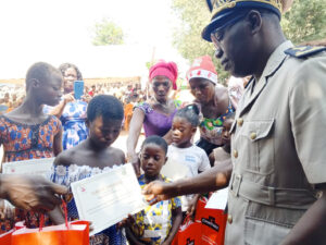 Il s’est également adressé aux élèves et enfants à l’honneur. « Chers enfants, aujourd’hui, grâce à votre grande sœur, à votre maman, vous avez bénéficié de cadeaux. Pour ma part, je voudrais vous encourager, vous féliciter et surtout vous inviter à bien travailler à l’école. Est-ce que vous allez bien travailler à l’école ? », a-t-il interrogé les enfants qui ont répondu « Oui ». « D’accord, donc, on compte sur vous pour que cette localité-là ait de nombreux cadres, pour continuer l’œuvre de votre maman », a conseillé le sous-préfet Essé.